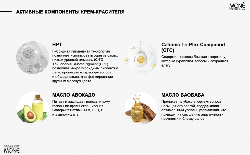 Гибридная пигментная технология позволяет нам использовать один из самых низких уровней аммиака в сегменте профессиональных красок-всего 0,4%. Сверхнизкий уровень аммиака деликатно воздействует на кутикулу волоса, не обладает специфическим ароматом. Краска использует инновационную технологию Cluster Pigment(CPT), которая позволяет микрогибридным пигментам легко проникать в структуру волоса, объединяться и формировать крупные молекулы пигмента. Групирование молекул пигмента возникает сразу при контакте с волосами. Этот процесс запускается не при смешивании краски, а только при нанесении на волосы. Что позволяет цвету иметь равномерную насыщенность на каждом участке, вне зависимости от времени нанесения. Результатом является непревзойденная яркость цвета и стойкость окрашивания.